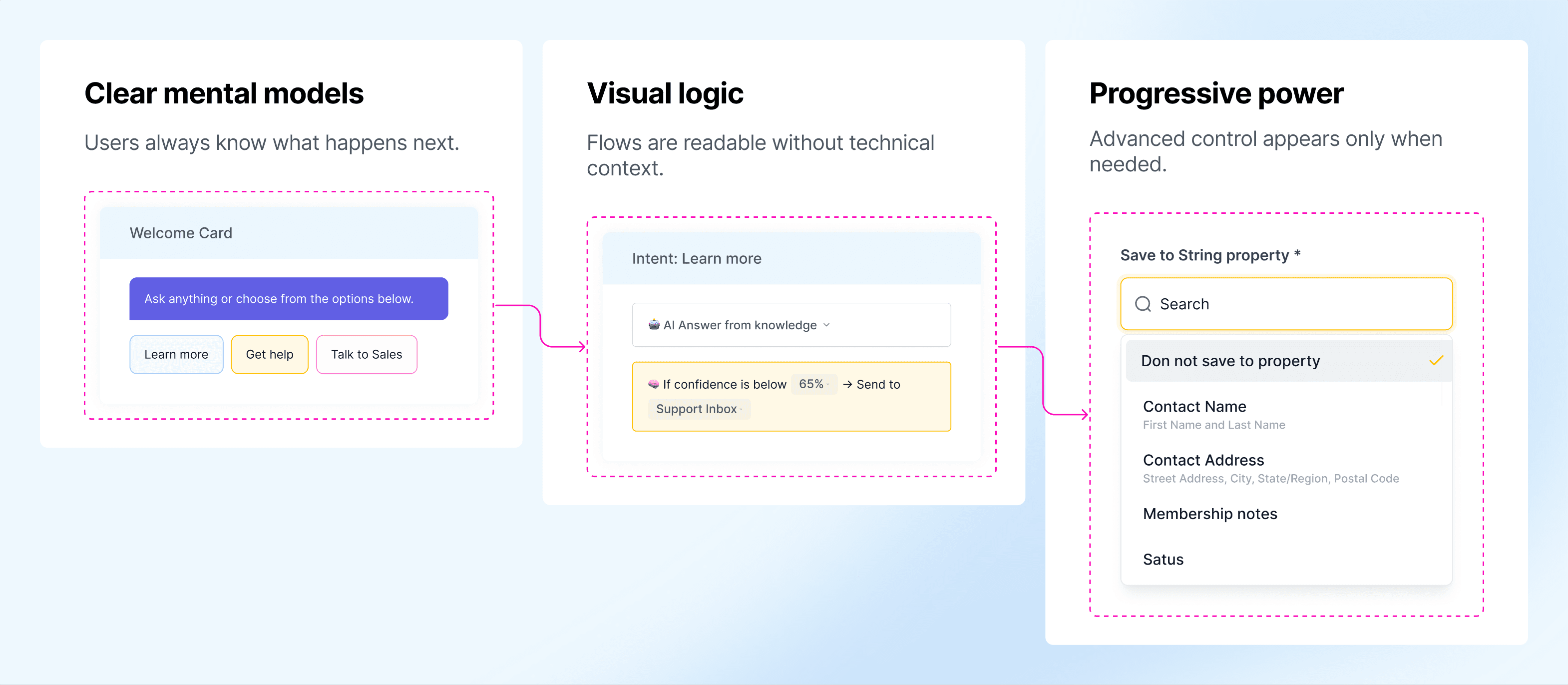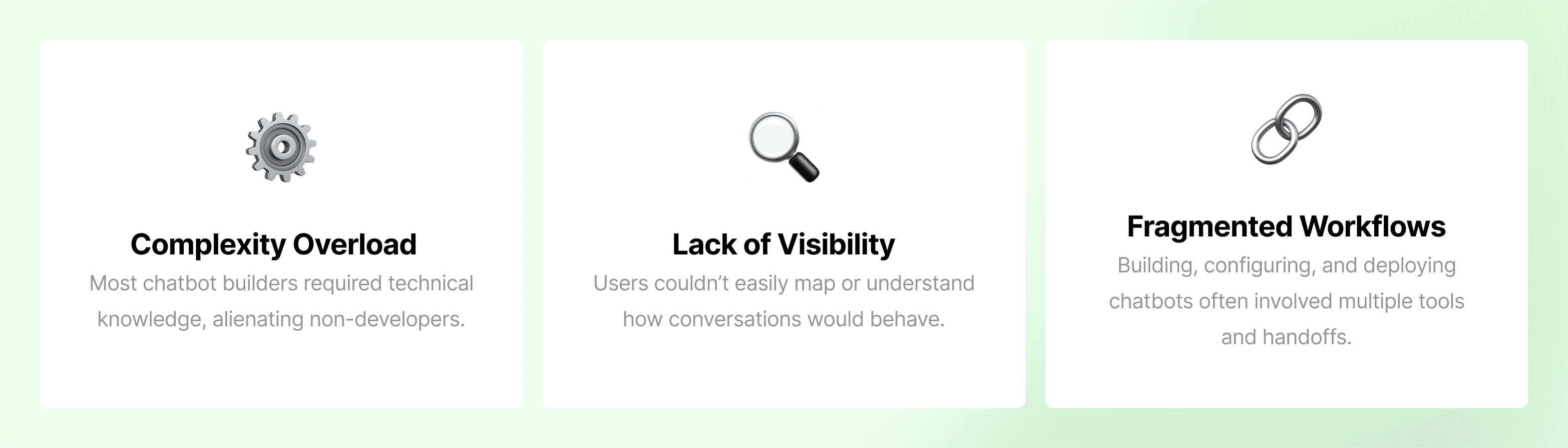Across roles, one insight stood out: teams needed a chatbot builder that felt intuitive and predictable, while still being powerful enough to support real customer interactions.