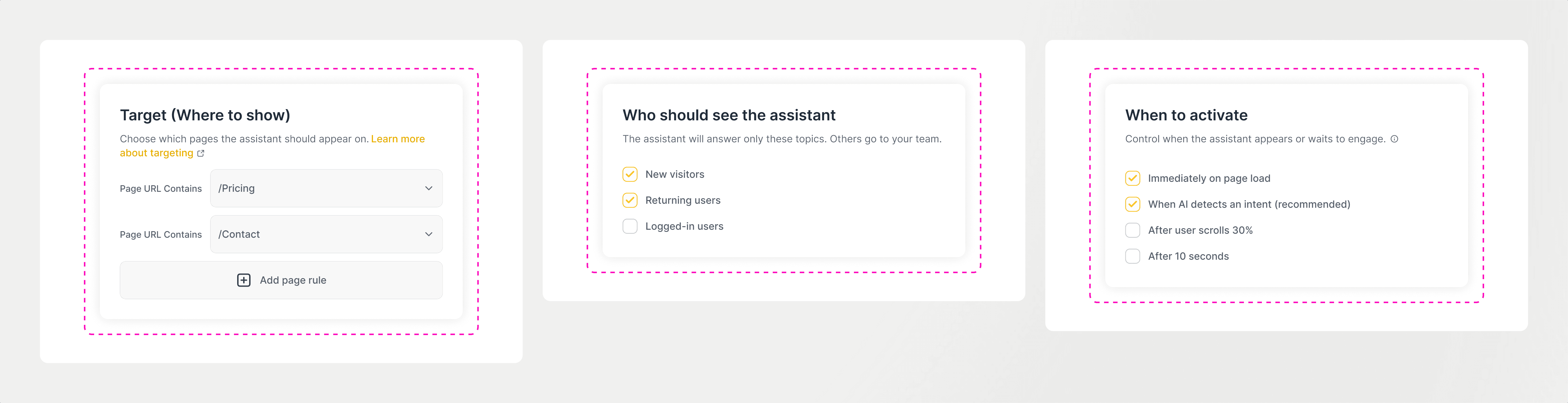 Teams can control where the chatbot appears, who it interacts with, and how it behaves across channels. The same assistant can respond differently depending on page, audience, or use case, while still following a consistent conversational logic.