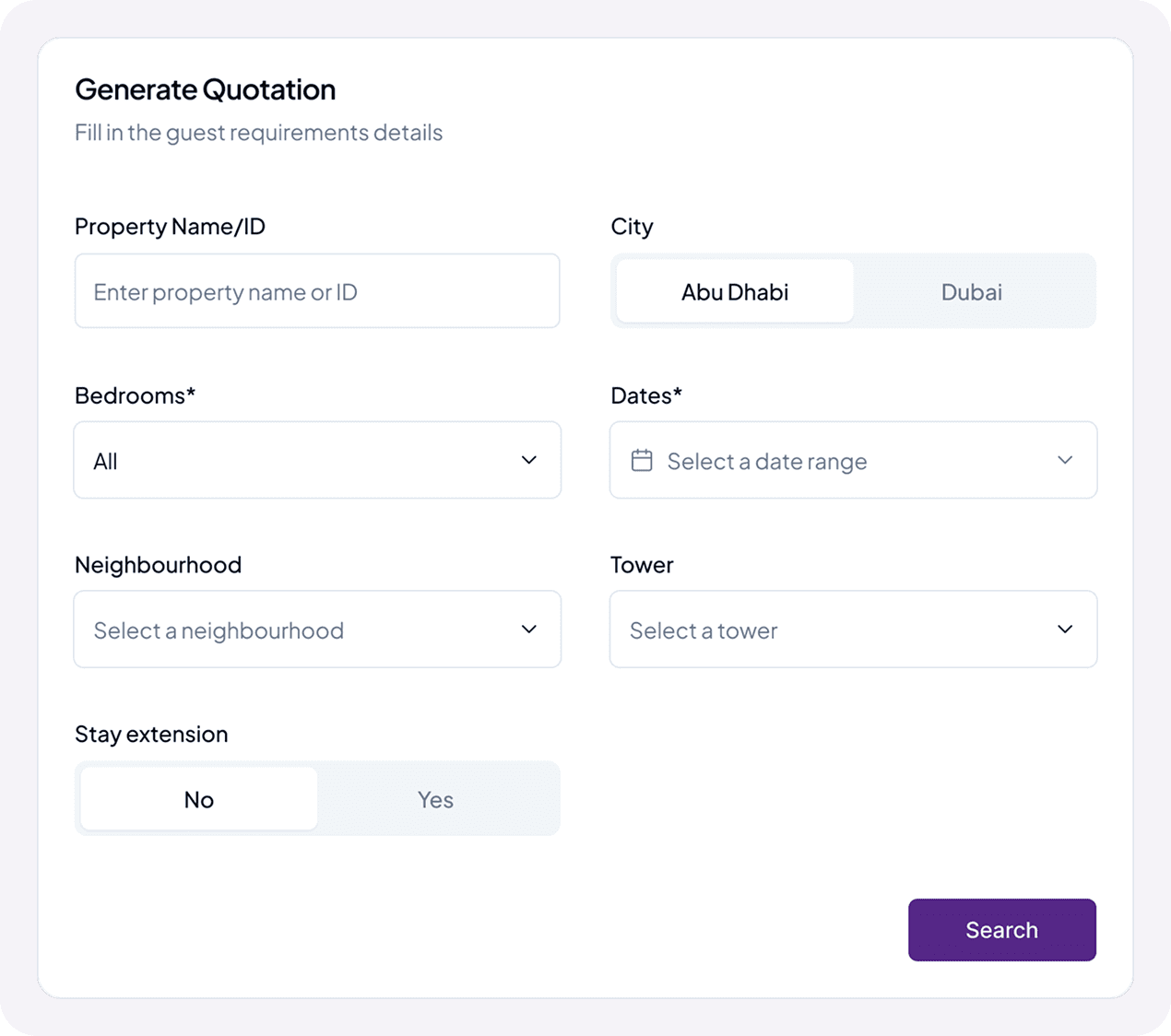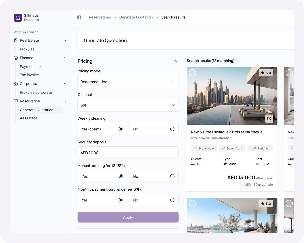 Smart, controlled recommendations. Apartments are auto‑filtered by location, while reservation managers control editable pricing and discount rules.