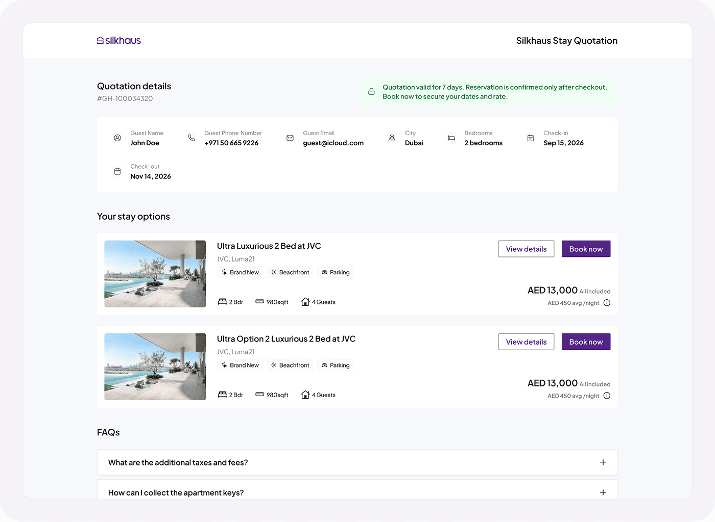 Interactive quote pages. Customers can explore listings directly from the quotation without leaving the flow.