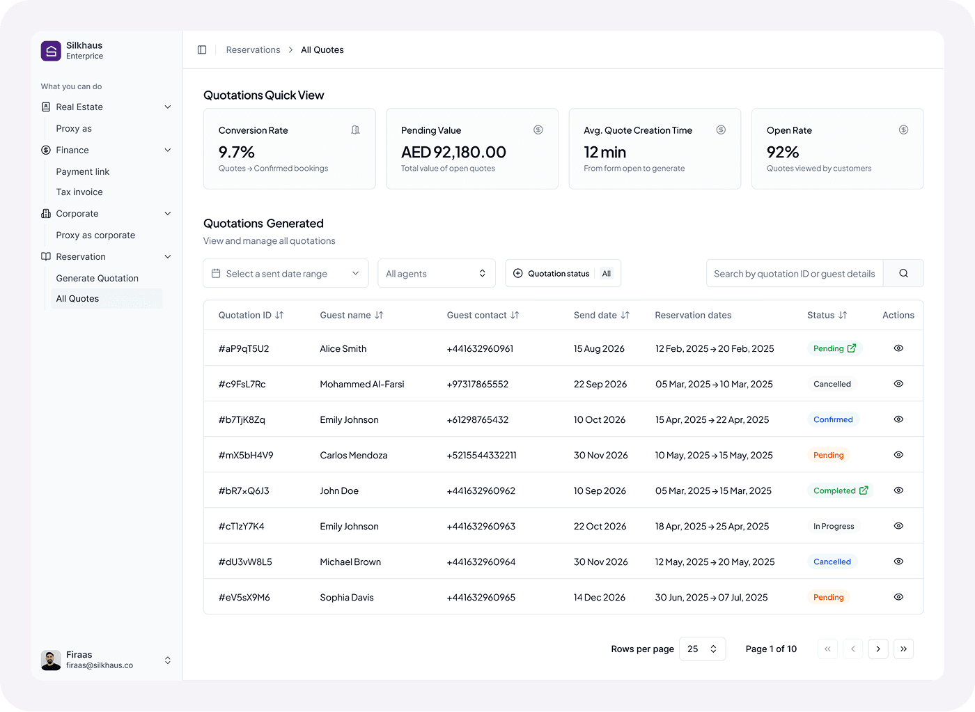 A unified dashboard lets agents manage, track, and follow up on all quotes.